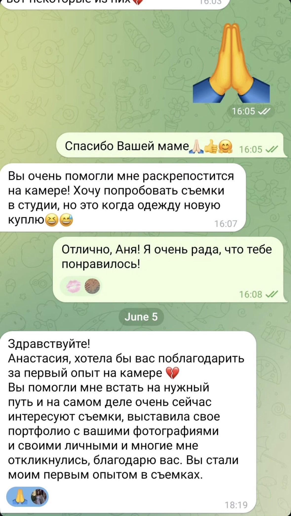 Привет! Я Анастасия —профессиональный фотограф, занимаюсь организацией съемок с 2019 года. Момент магии, который случается, когда модель проявляется перед объективом для меня бесценен.